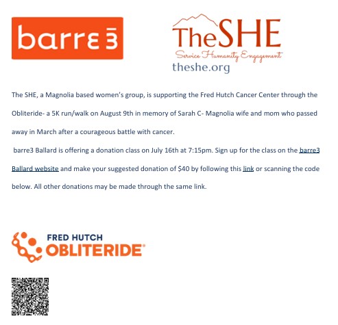 The SHE, a Magnolia based women’s group, is supporting the Fred Hutch Cancer Center through the Obliteride- a 5K run/walk on August 9th in memory of Sarah C- Magnolia wife […]